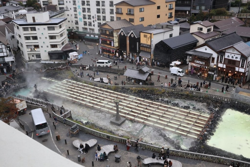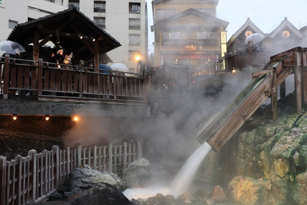 中心に位置する「湯畑」では毎分数千リットルの源泉が湧き出し、立ち上る湯けむりが印象的です。